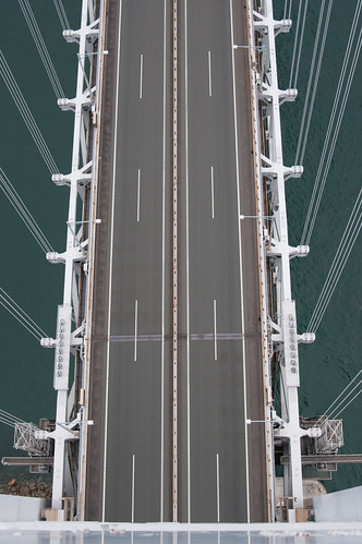 主塔にたどり着いたらまた階段を登って道路のレベルに出て、今度はそこからハッチをくぐって主塔内部に入り、またエレベーターに乗ります。このエレベーターは一般的な日立製のもので、乗り込んだところが5階、塔頂部は10階となっていて、点検作業の際は各階で乗り降りすることができるようです。今回は一気に10階の頭頂部まで上がりましたが、実にあっけないものです。エレベーターを降りてから階段で数メートル上がると、もう頭頂部の左右をつなぐ横桁部に出ることができました。